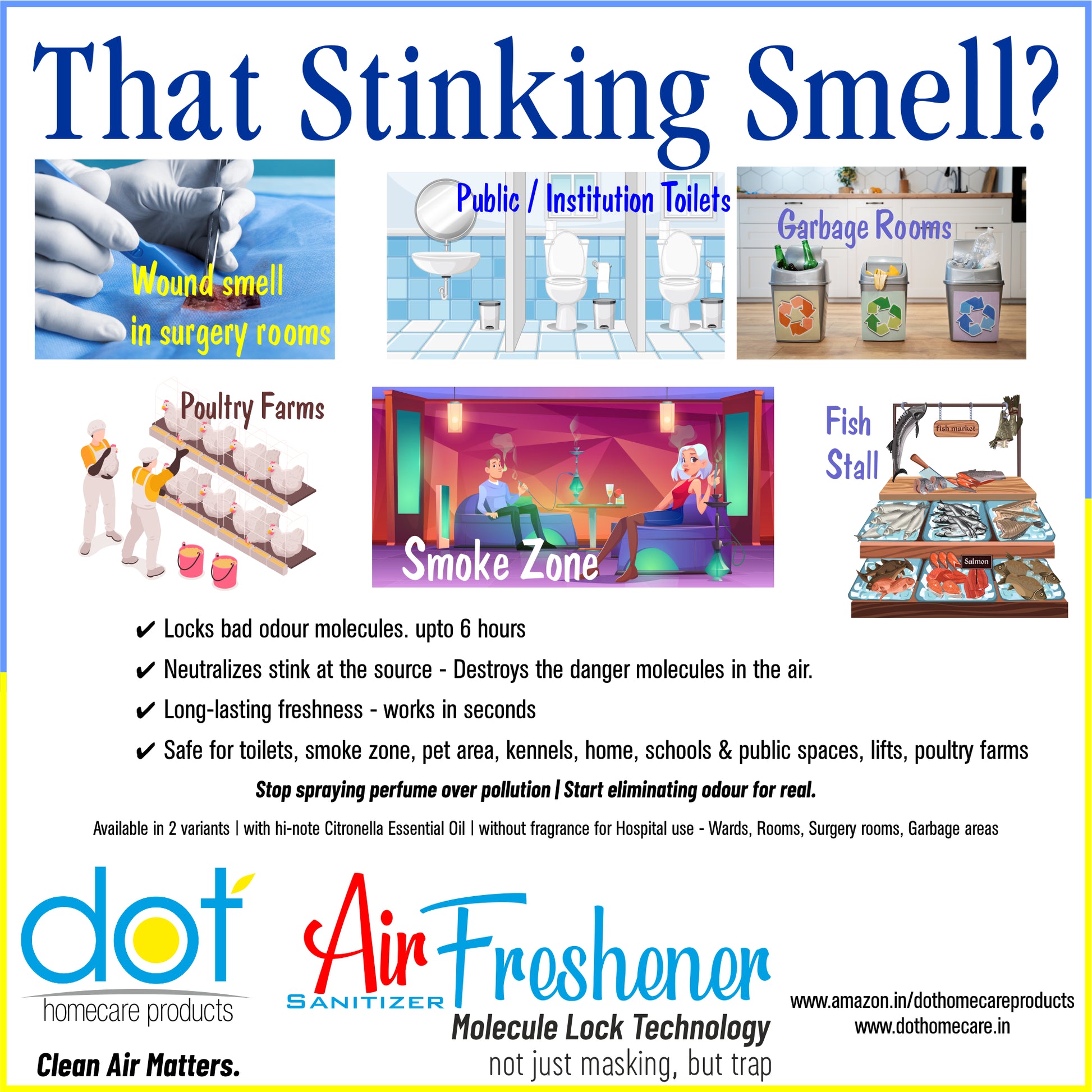 - 💨 Specific Odour Types: Urine smell Sweat odour Smoke smell Food odour Moisture / damp smell Closed-room stale smell Garbage odour Fabric-trapped odours Drain smell 🏫 Institutional / Public Areas School classrooms (closed-room smell), School buses, College washrooms, Office restrooms, Hospital waiting areas, Clinic reception rooms, Hostels & dormitories, Staff rooms 🏠 Residential Areas Bathrooms & toilets, Kitchen (after cooking non-veg / fried food), Shoe racks, Closed cupboards & wardrobes, Garbage area, Pet areas, Living rooms before guests arrive, Bedrooms with low ventilation 🚗 Vehicles School buses, Cars, Vans, Ambulances, Transport vehicles 🏢 Commercial Spaces Restaurants (after peak hours), Hotel rooms, Gym locker rooms, Salons & spas Shopping complex restrooms, Warehouses, Cinema halls