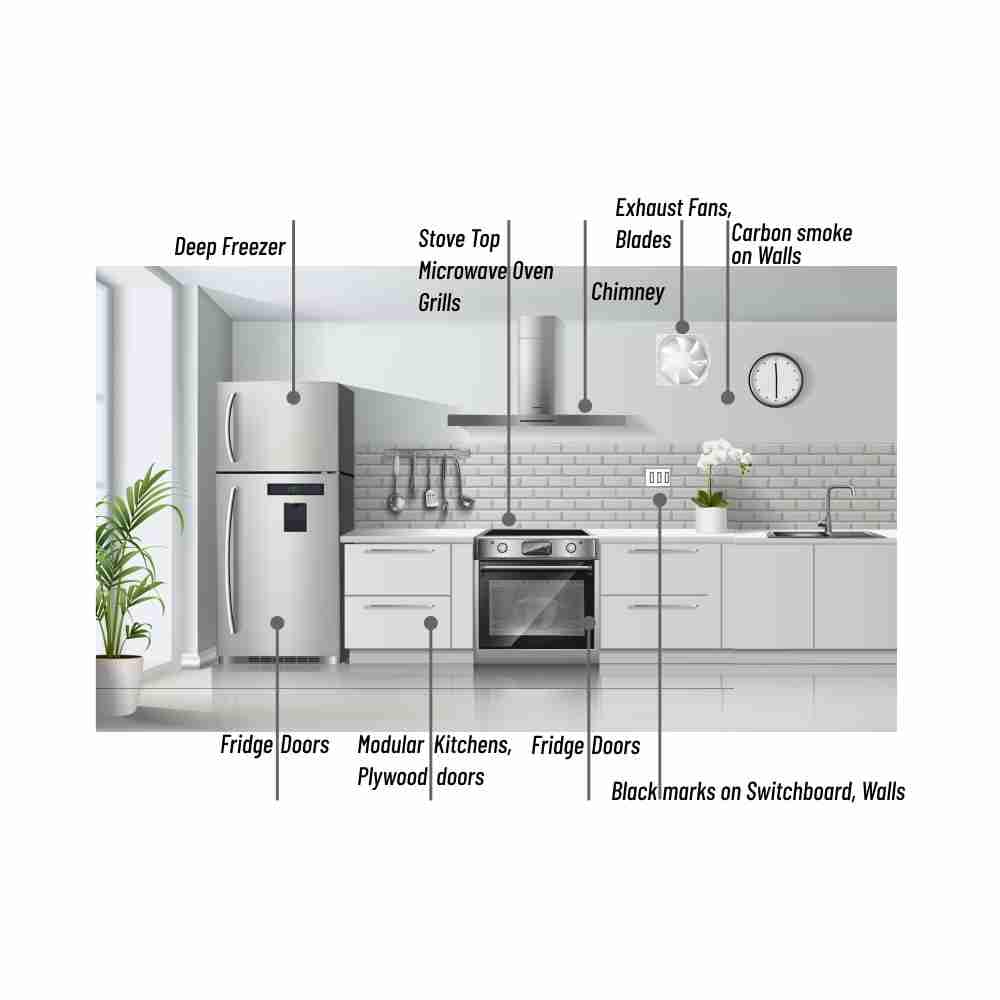 - One solution with multiple actions – kitchen surfaces, table tops, counter tops, gas hobs, gas stoves, burners, sink, tiles, chimney, oven, grill, fridge, exhaust fans, fan blades, and crayon colours on walls, sticker marks, gum remover, adhesive gum stains, permanent marker stains, switch boards, cylinder marks. Removes white patches around Sink area.